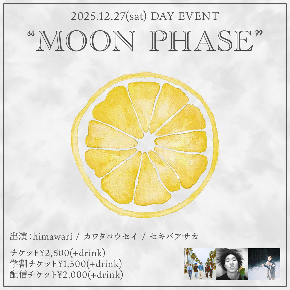 “MOON PHASE” RESERVE 2025/12/27(土) 13:00 - 三軒茶屋Grape Fruits Moon 地図を表示 OPEN12:30 / START13:00 12月27日(土) 「MOON PHASE」 【出演】 himawari カワタコウセイ セキバアサカ 12:30OPEN/13:00START 来場チケット¥2,500(+D) 学割チケット¥1,500(+D)※要学生証提示 チケットご予約 URLをコピーする 報告する
